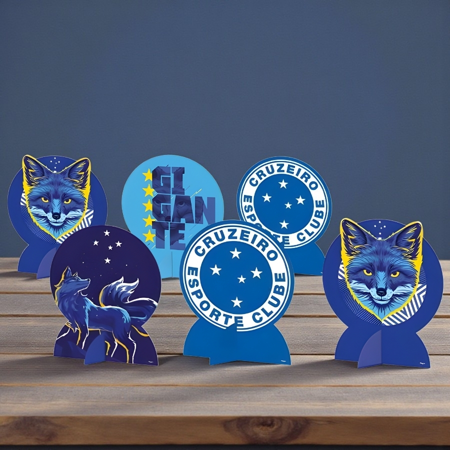 Decoração de mesa com tema Cruzeiro, dimensões 14x18x9cm. Leve, prática e fácil de posicionar, ideal para festas, eventos e comemorações de torcedores.