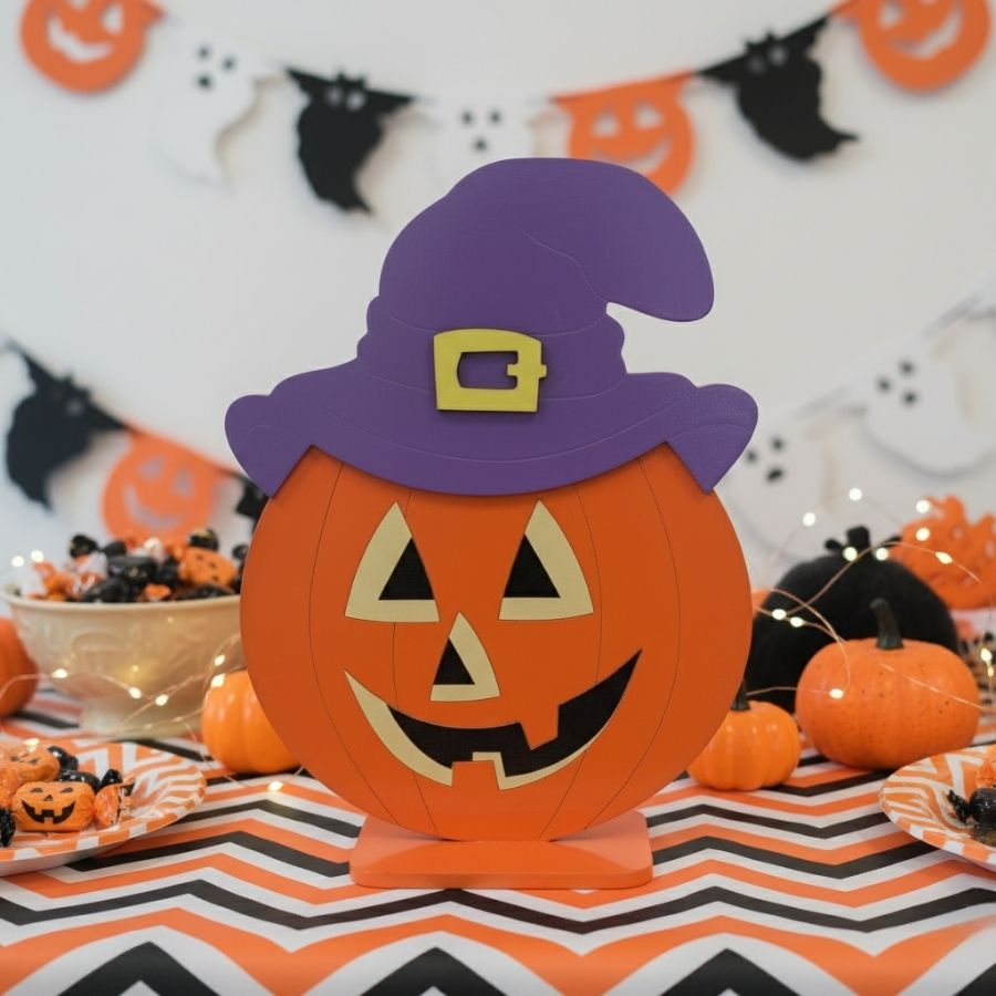 O Display de Mesa em MDF Abóbora com Chapéu Laranja e Roxa 26x25,5cm é resistente, divertido e ideal para compor decorações temáticas de Halloween.