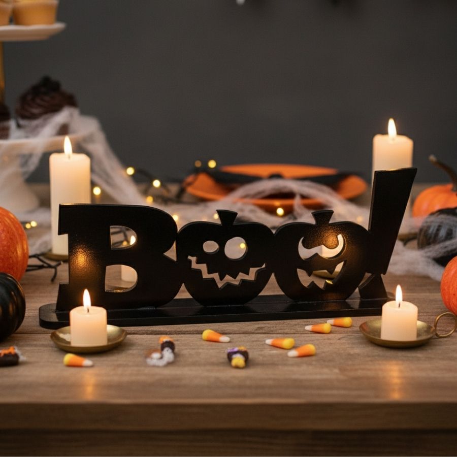 O Display de Mesa em MDF Boo! Preto 28,5x11x5cm é versátil, resistente e ideal para decorar mesas, festas e ambientes de Halloween com charme e diversão.