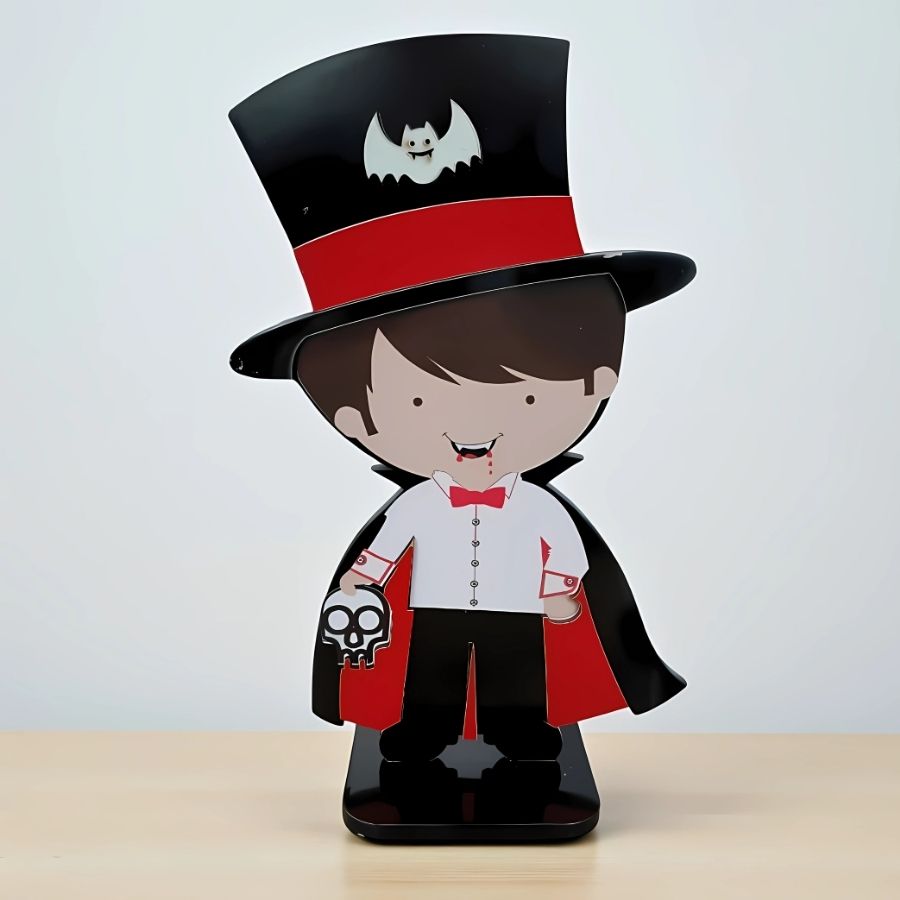 O Display de Mesa em MDF Drácula Preto/Branco/Vermelho 26x25,5cm é resistente, divertido e ideal para decorar festas e ambientes no Halloween.