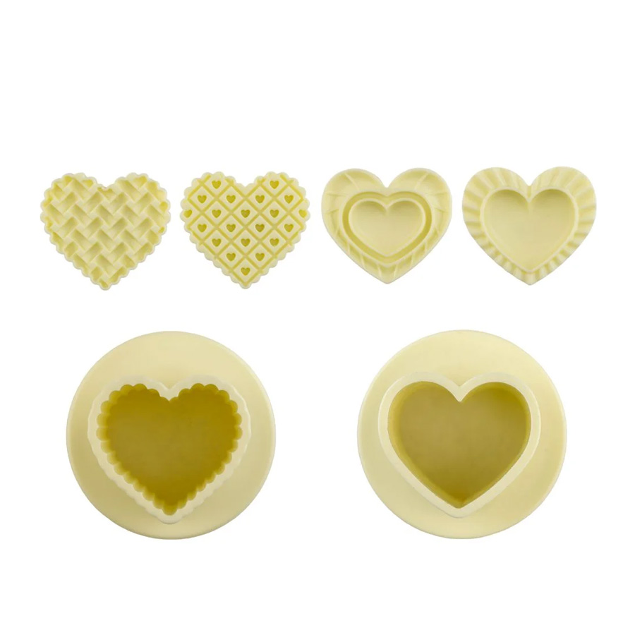4 Cortadores de ejetor em formato de corações bordados para criar detalhes em decorações culinárias.VENDA UNICAMENTE DOS CORTADORES, NÃO POSSUI BASE.