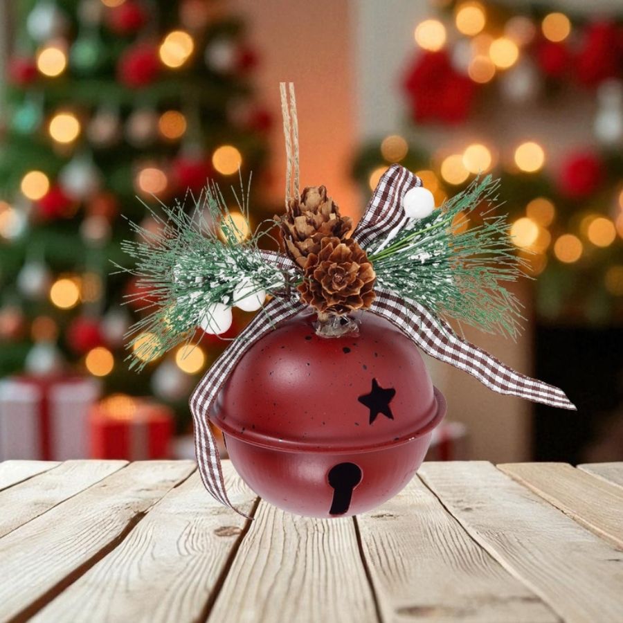 Enfeite para pendurar com guizo e pinhas na cor marrom, medindo 6cm. Ideal para decoração natalina com toque rústico e sonoro.