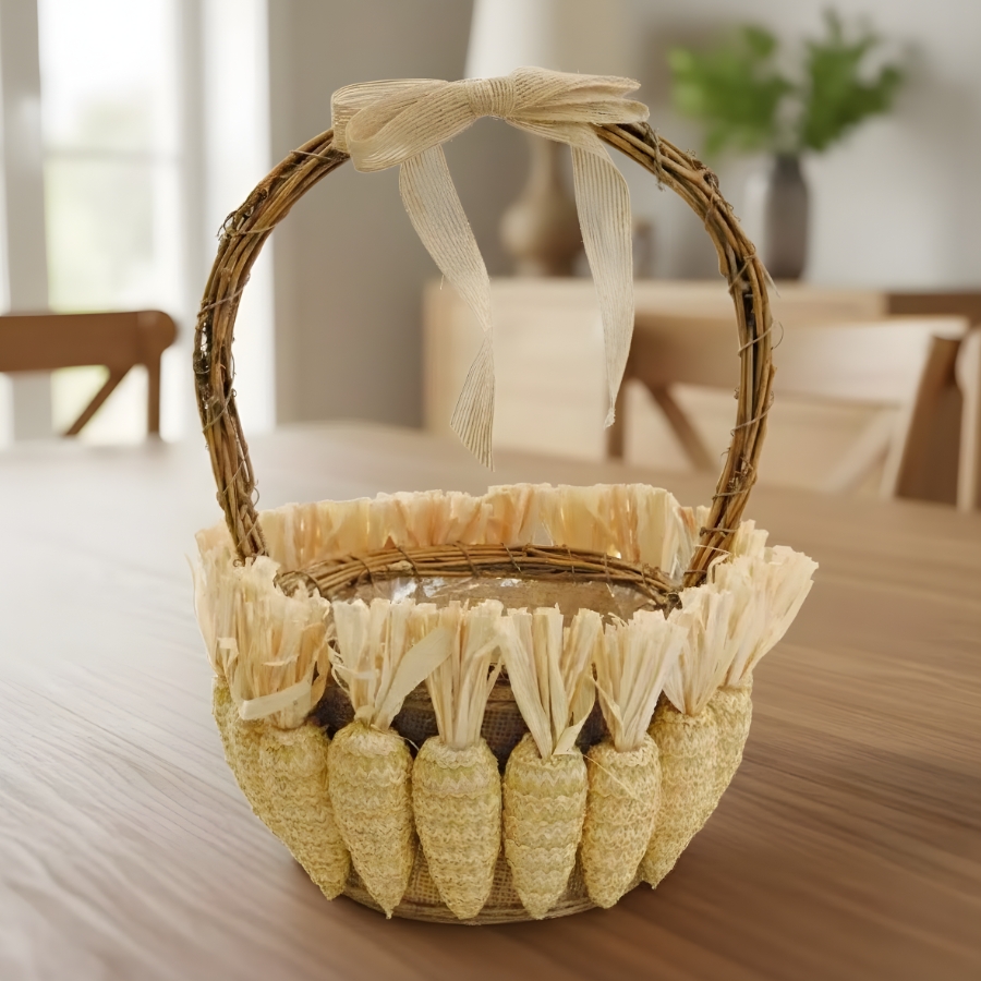 O Enfeite Decorativo de Páscoa - Cesta com Cenouras - 32cm é uma peça charmosa e vibrante, ideal para dar um toque alegre e temático à sua decoração de Páscoa.