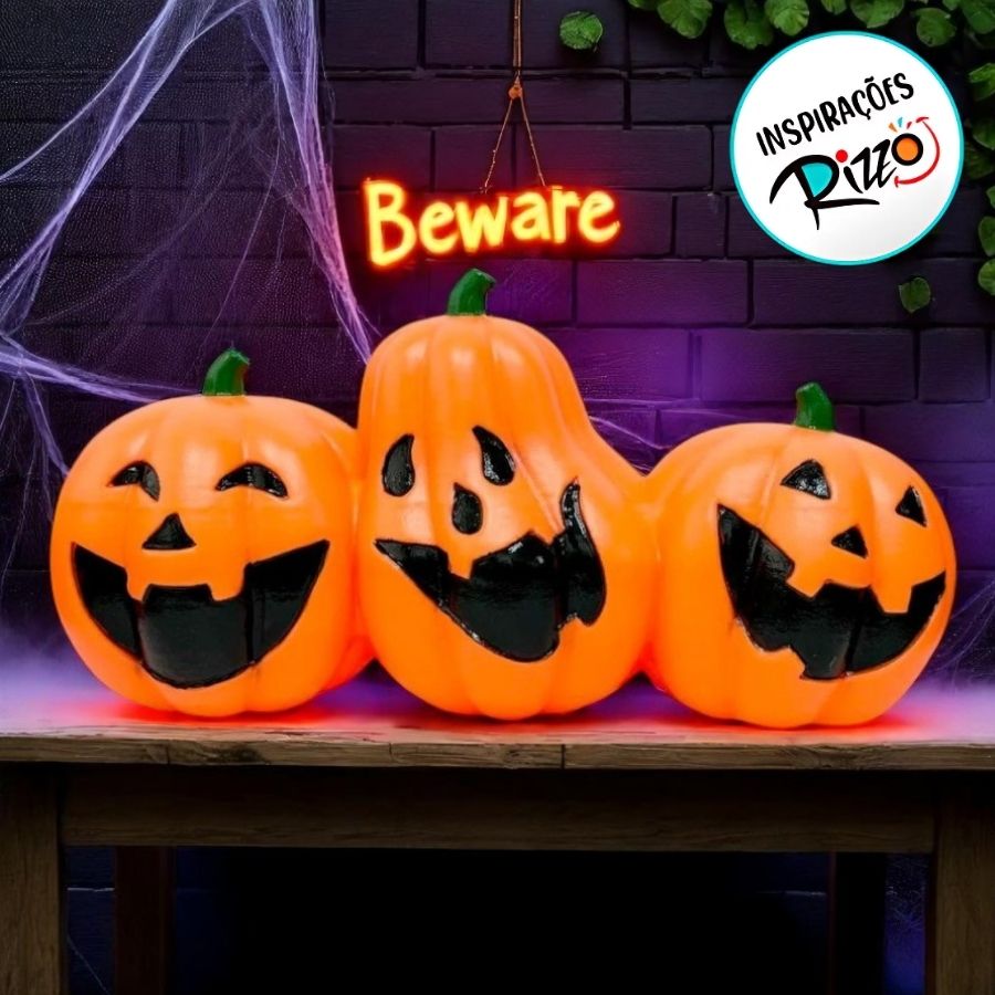 Produzido em material resistente, este trio de abóboras é ideal para entradas, salas ou vitrines, oferecendo detalhes ricos e design original. Um item indispensável para quem deseja criar um ambiente impressionante e divertido nas festas de Halloween.