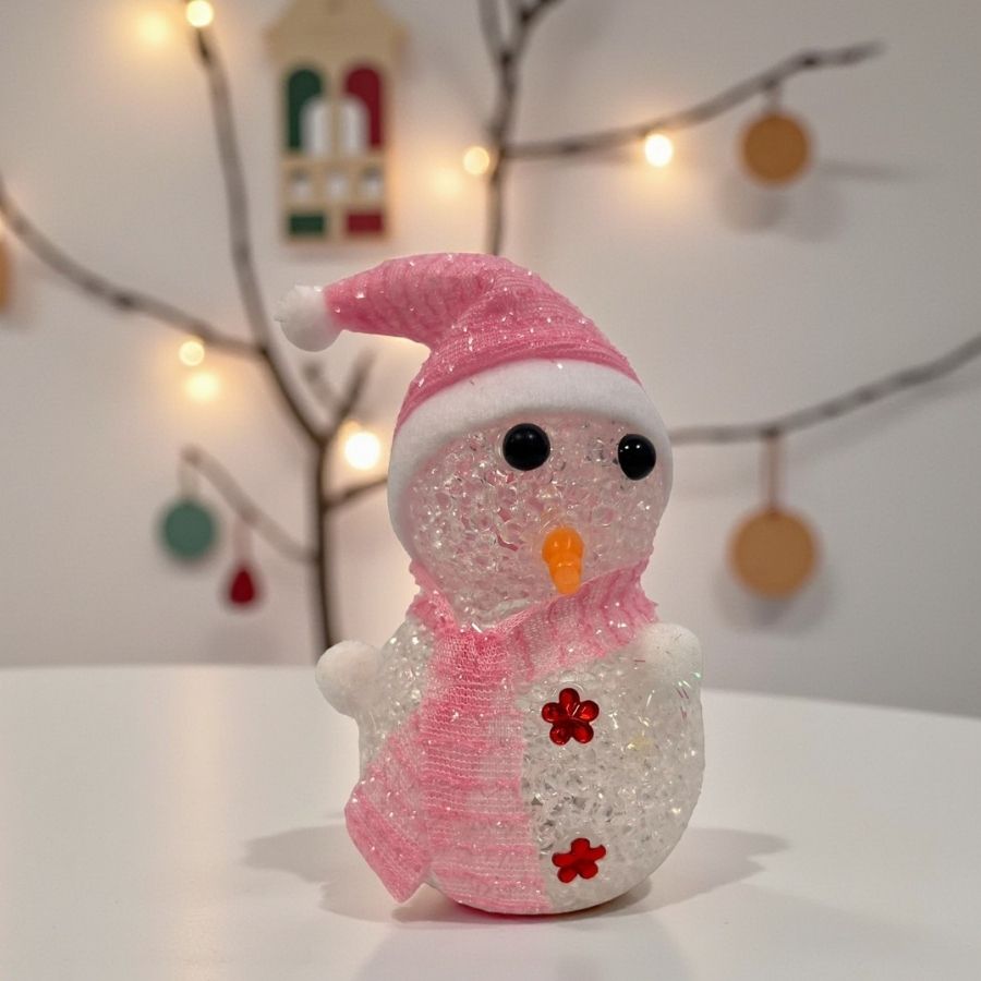 O Enfeite Decorativo de Natal Boneco de Neve com cachecol e luz rosa de 18cm é iluminado, delicado e moderno, ideal para compor ambientes natalinos alegres e sofisticados.