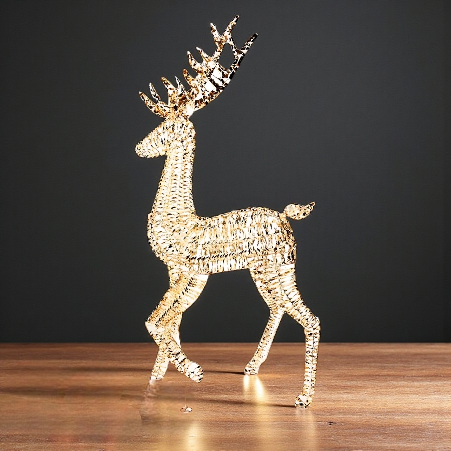 Trata-se de uma rena decorativa em estrutura de metal com acabamento dourado, equipada com iluminação em LED e sistema bivolt. Suas medidas são 185x36x86cm, oferecendo presença marcante para decorações natalinas internas ou externas. Resistente, sofisticada e fácil de instalar, é ideal para compor cenários de destaque.