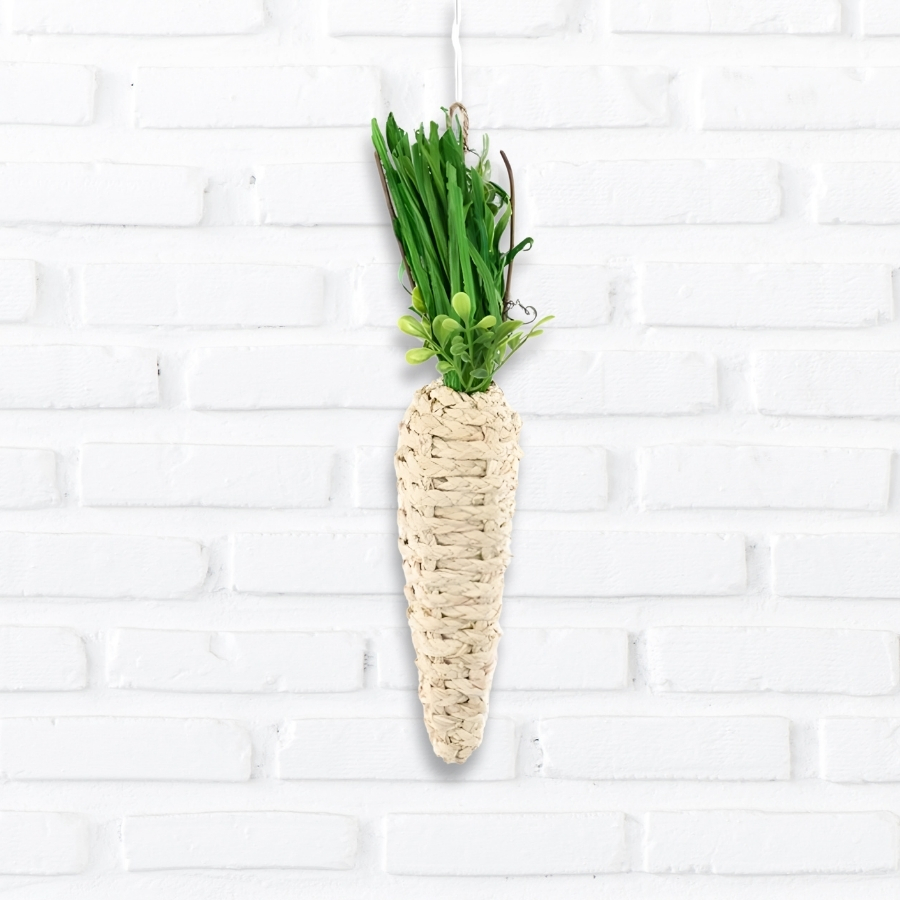O Enfeite Decorativo de Páscoa - Cenoura de Palha - 33cm traz um toque rústico e charmoso para a decoração pascoalina, com acabamento artesanal e materiais naturais.