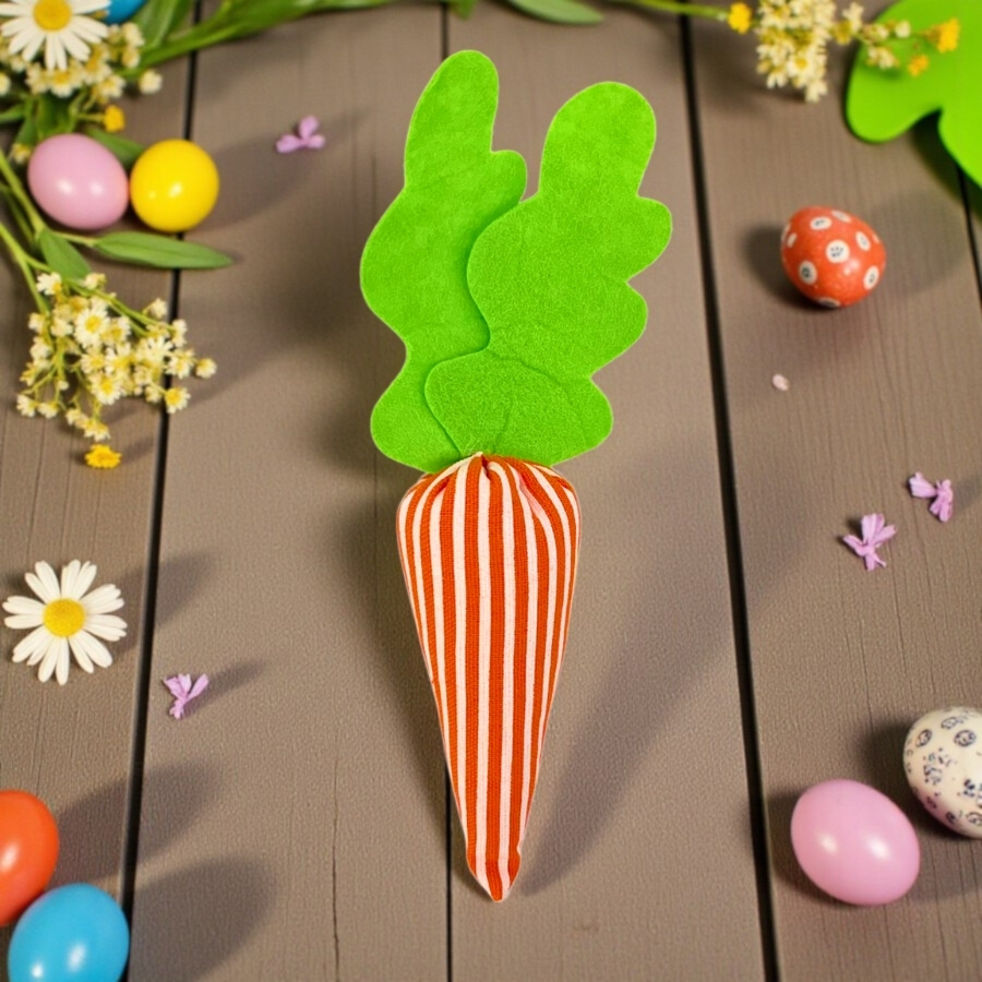 A Cenoura Listrada mede 18x6x6cm e é confeccionada em material leve e resistente, com acabamento detalhado em listras branco, laranja e verde. Ideal para complementar mesas decoradas, cestas de Páscoa, arranjos e vitrines, garantindo destaque e charme à decoração temática.