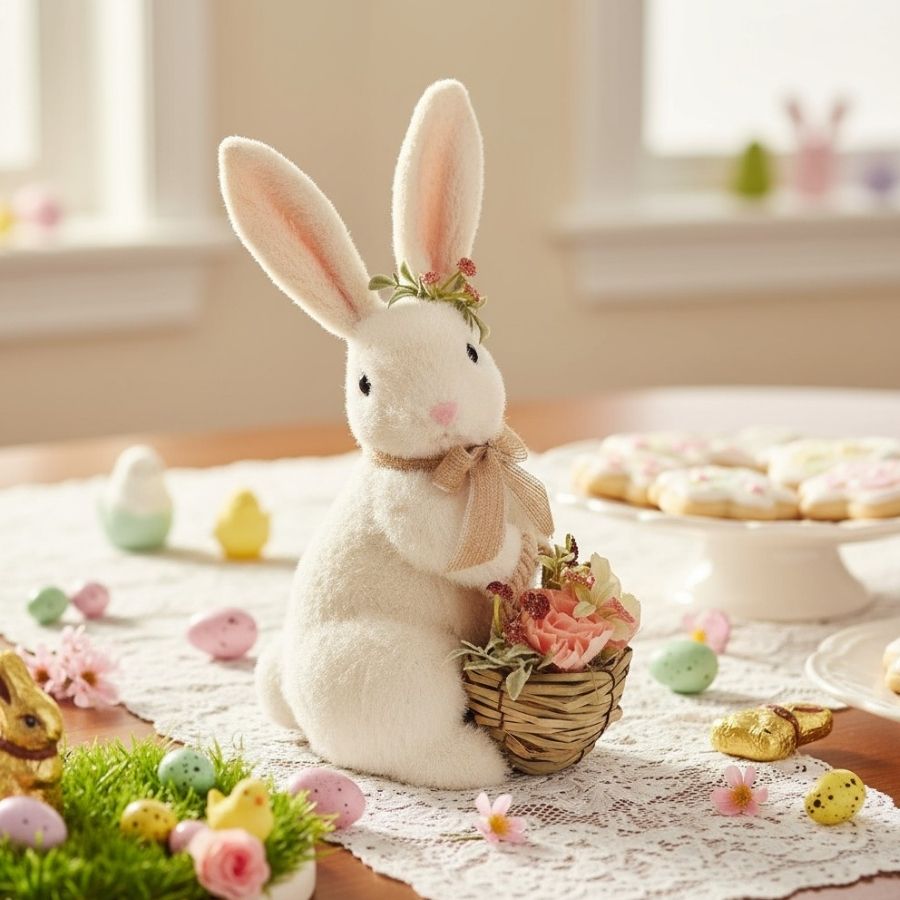 Coelho decorativo segurando cesta de flores, 32x20x13cm, ideal para decoração de Páscoa, lembrancinhas e composições artesanais.