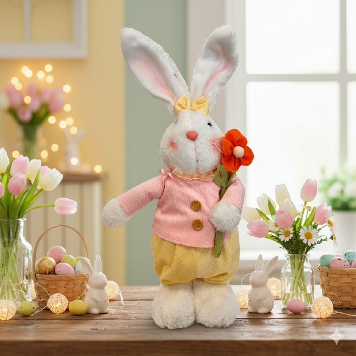 Posicione o coelho em destaque na mesa principal, em arranjos de Páscoa ou combinado com outros enfeites, flores e cestas temáticas. Ele também pode ser usado em composições de vitrine ou em ambientes internos, trazendo um toque acolhedor e festivo.