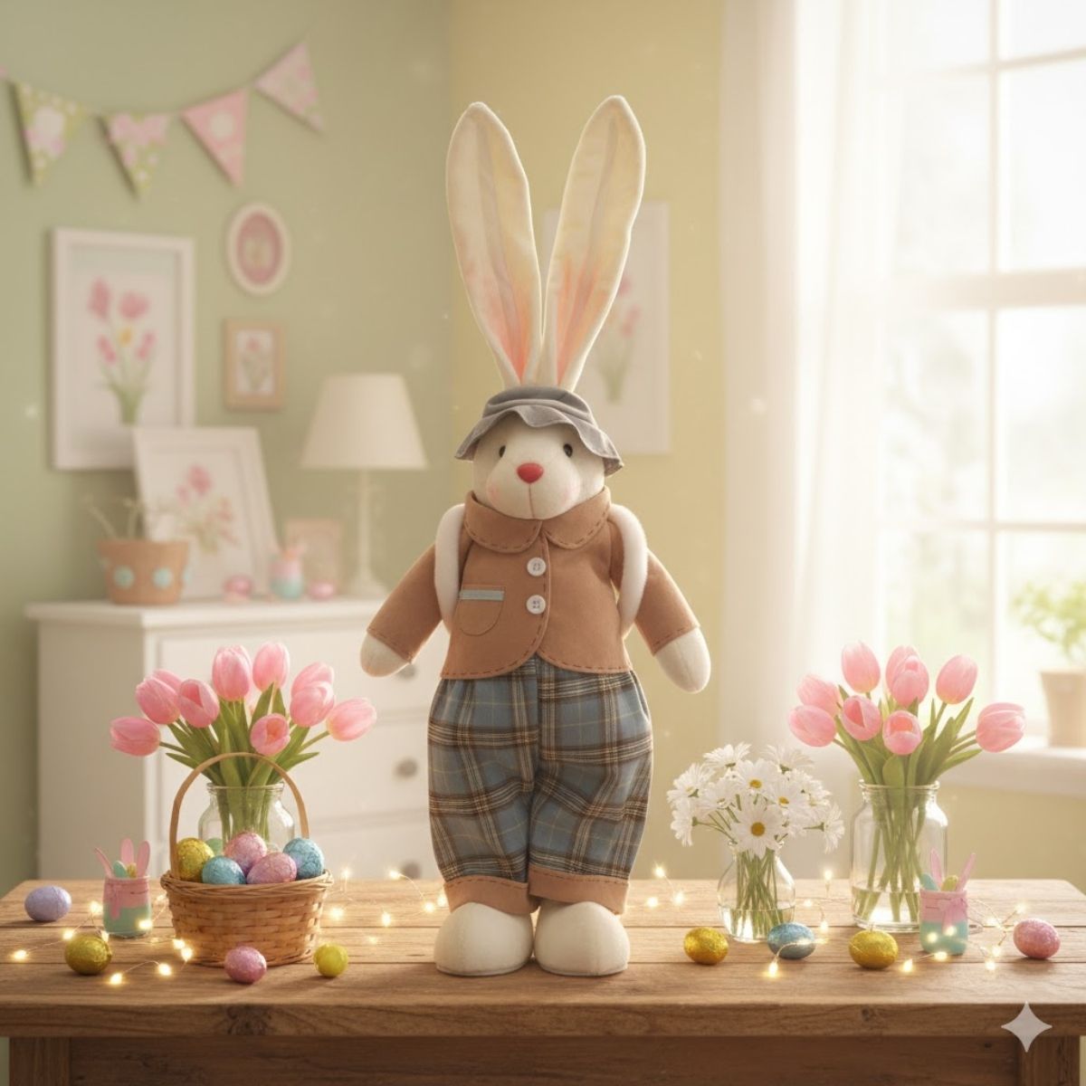 Posicione o coelho em destaque na mesa principal ou em composições decorativas com flores, cestas e ovos coloridos. É ideal para vitrines, ambientes internos e cantinhos temáticos que pedem um toque de ternura e criatividade.