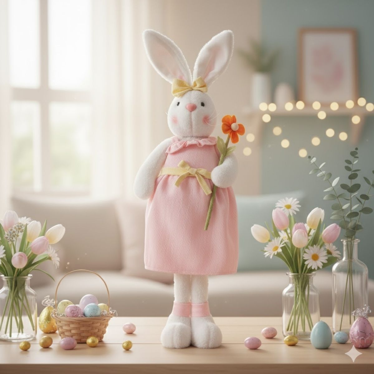 Coloque a coelhinha em locais de destaque, como mesas decoradas, halls de entrada ou junto a outros elementos temáticos de Páscoa. Combine com ovos, flores e cestas para criar um cenário acolhedor e encantador.