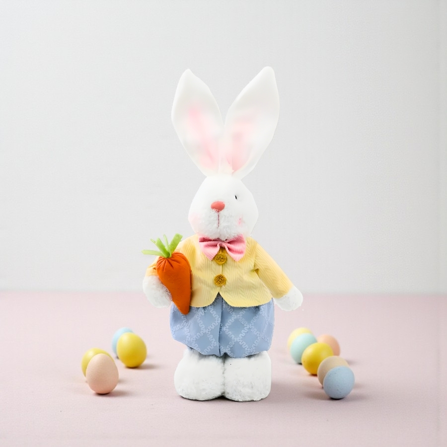 O enfeite mede 43x14x8cm e representa um coelho em pé segurando uma cenoura, confeccionado com materiais de alta qualidade e acabamento artesanal. É ideal para decorações de Páscoa residenciais, comerciais ou eventos temáticos, trazendo um toque alegre e sofisticado.