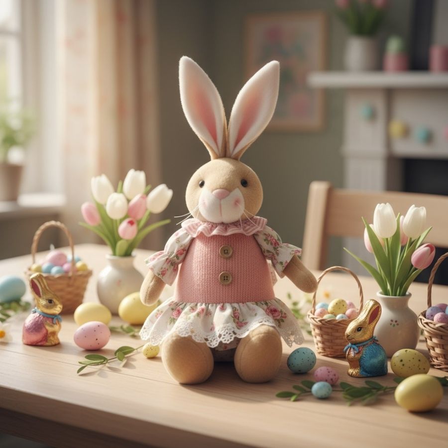 Este coelho decorativo se destaca pelo acabamento cuidadoso e pelos detalhes no vestido e expressões faciais, tornando-o perfeito para arranjos de Páscoa, composições com flores artificiais, ovos decorativos e outros elementos temáticos. Sua base estável garante segurança e facilidade na exposição, podendo ser combinado com outros enfeites para criar cenários encantadores e personalizados.