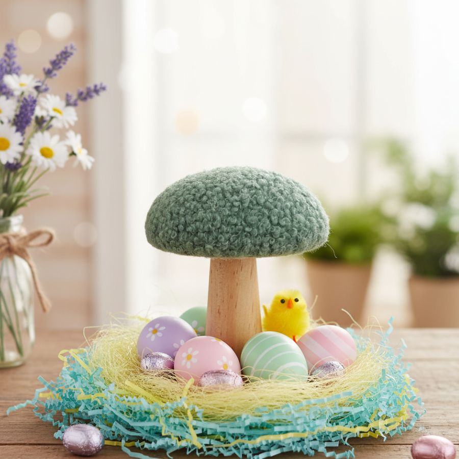 O Enfeite Decorativo de Páscoa Cogumelo Felpudo M Verde é encantador e delicado, perfeito para composições temáticas que unem elegância, suavidade e um toque natural.