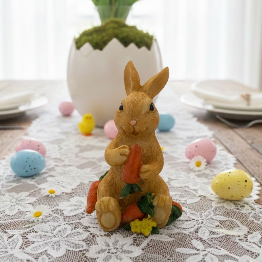 Enfeite decorativo de Páscoa em resina no formato de coelhinho segurando cenoura, ideal para mesas e cenários temáticos. Mede aproximadamente 8x3cm e adiciona charme e delicadeza à decoração pascal.