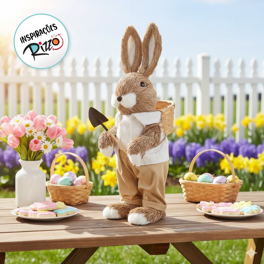 Além do design charmoso, o coelho decorativo combina perfeitamente com diferentes estilos de decoração pascal, criando uma atmosfera acolhedora e lúdica. A cestinha e a pá adicionam um toque narrativo à peça, tornando-a perfeita para quem deseja enriquecer a decoração com personalidade e simbolismo.
