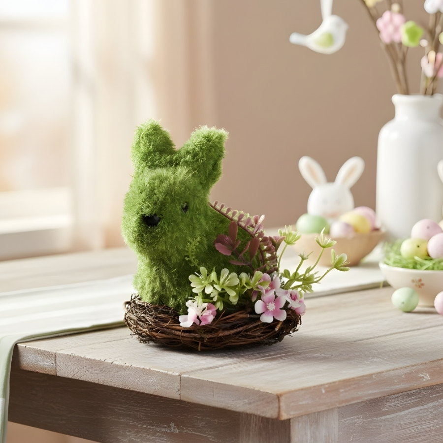 O enfeite decorativo de Páscoa no modelo coelho verde no ninho possui dimensões aproximadas de 12x16x16cm. Desenvolvido exclusivamente para uso decorativo, é indicado para composições em mesas, vitrines, aparadores e diferentes ambientações temáticas de Páscoa.