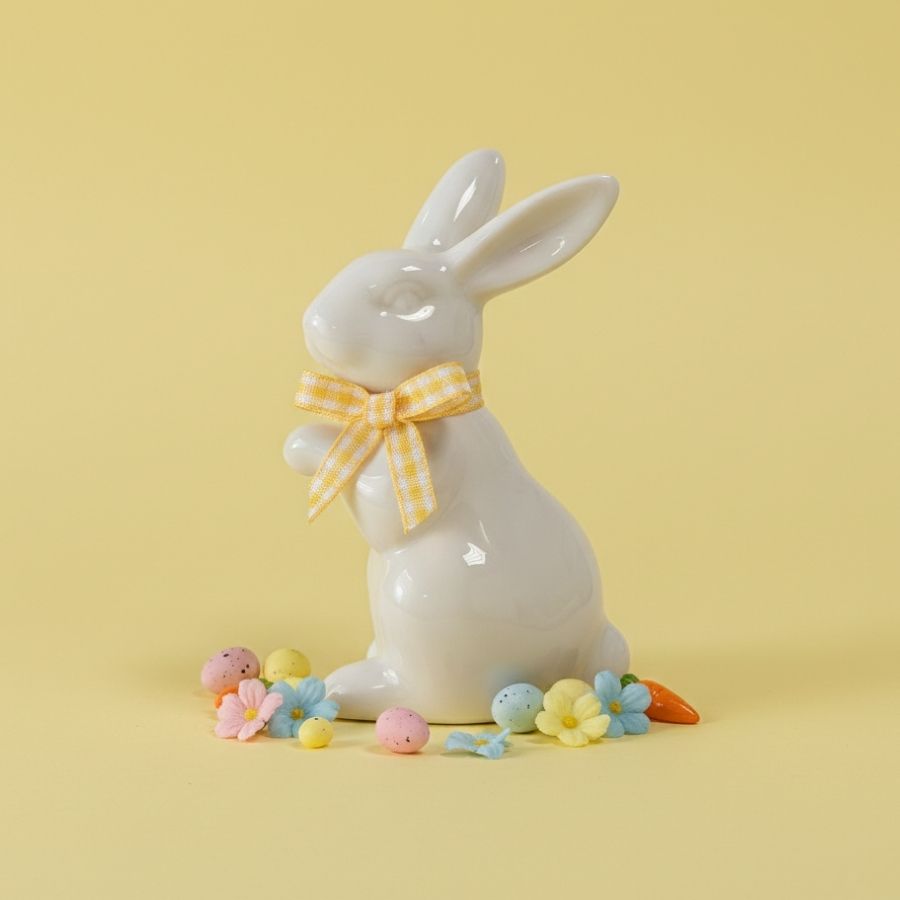 Enfeite decorativo de Páscoa em porcelana amarela com coelho de pé e laço, tamanho 6x5x9,5cm, ideal para composições alegres e temáticas.