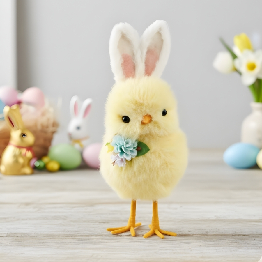 O enfeite decorativo de Páscoa no modelo pintinho amarelo com orelha de coelho possui dimensões aproximadas de 14x30x10cm. Desenvolvido para uso decorativo, é ideal para composições em mesas, aparadores, vitrines e diferentes ambientações temáticas de Páscoa.