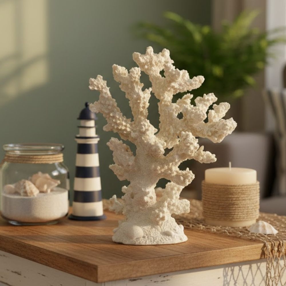 Ideal para uso em estantes, aparadores, mesas laterais ou composições temáticas, o enfeite de coral é perfeito para ambientes com inspiração marinha, praiana ou litorânea. Seu tom neutro facilita combinações com madeira, fibras naturais, tons areia e azul, criando um ambiente harmonioso e sofisticado.