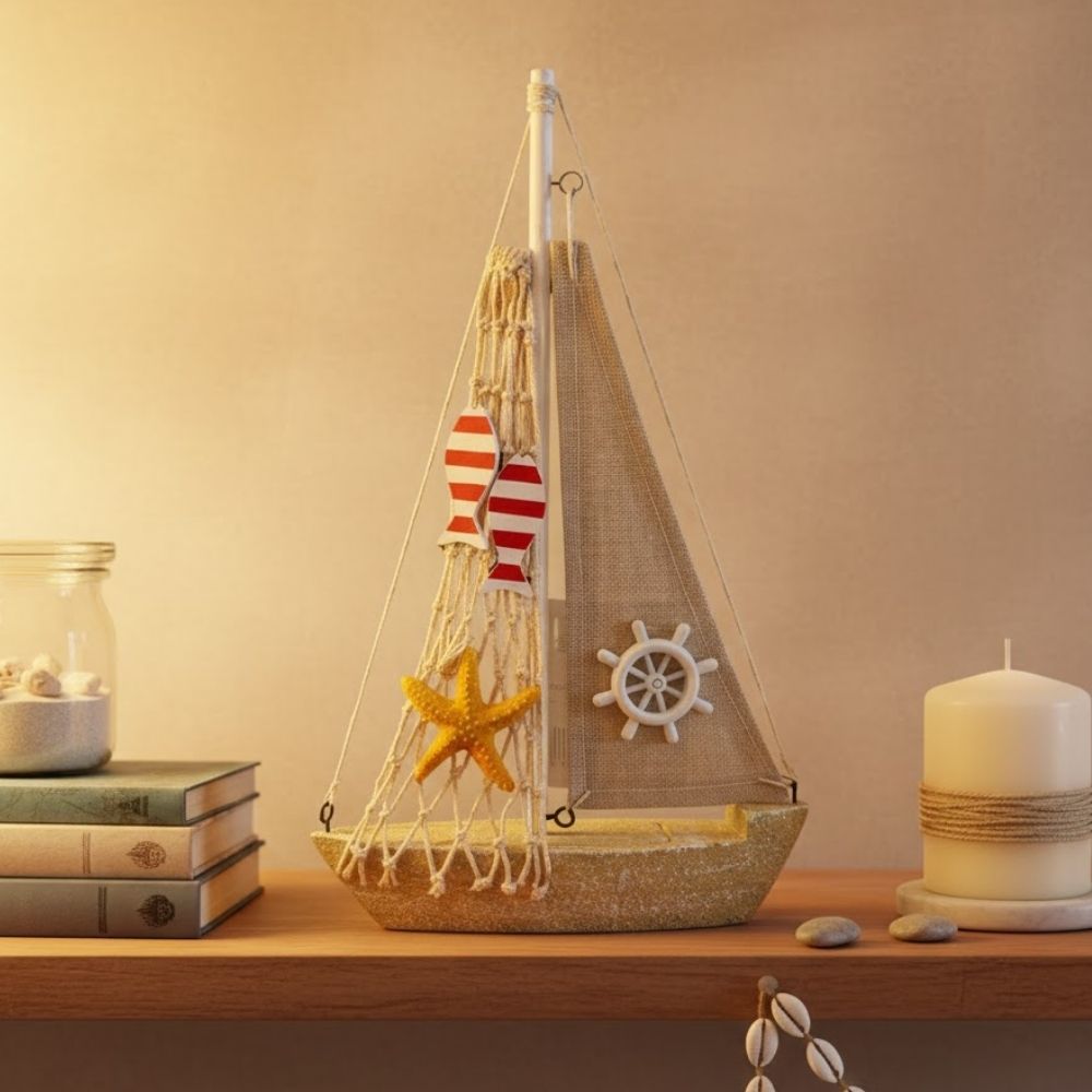 O veleiro possui rede de pesca decorativa, acompanhada de pequenos peixes e uma estrela-do-mar, detalhes que reforçam a inspiração no mar e criam um visual rico e acolhedor. Ideal para salas, varandas, áreas gourmet ou casas de praia, o enfeite marinho harmoniza facilmente com madeira, fibras naturais e tons neutros.