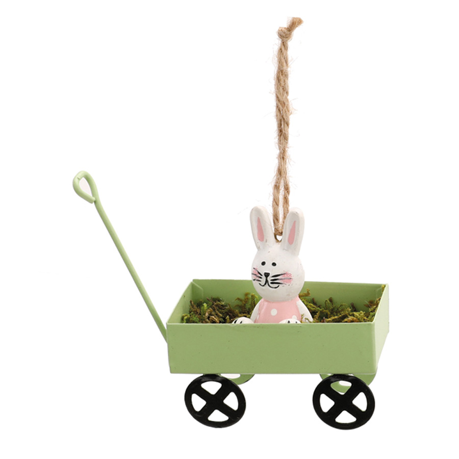 Enfeite para pendurar de carrinhos de mão verde, com coelha e musgo dentro do carrinho e com cordão de juta na cabeça para pendurar