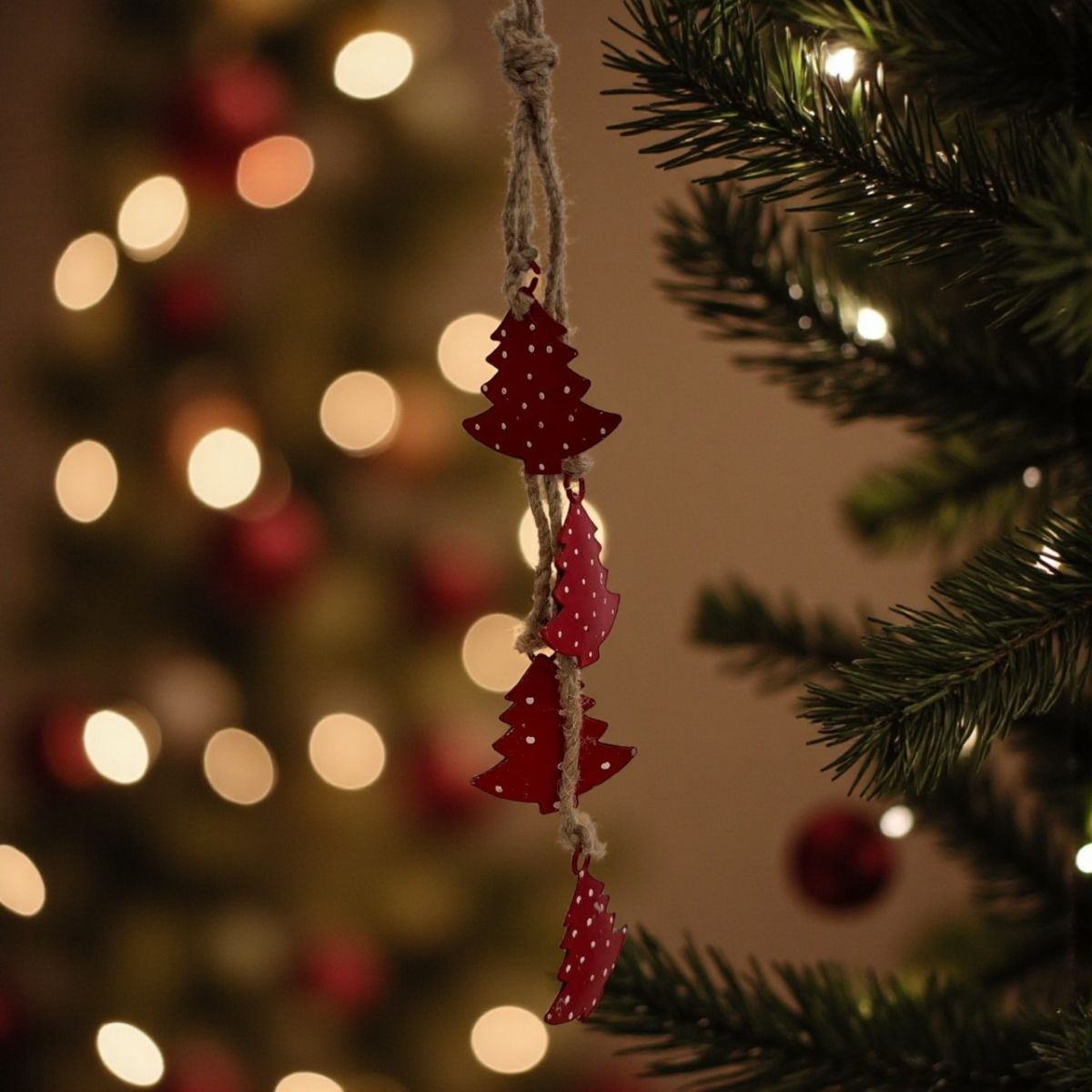 O Enfeite Para Pendurar de Natal - Árvores de Natal Vermelhas é uma peça charmosa e cheia de espírito natalino. O conjunto traz quatro pequenas árvores de Natal vermelhas com bolinhas brancas, todas unidas por um cordão decorativo, formando um enfeite alegre e versátil para compor diferentes cantinhos da sua decoração.