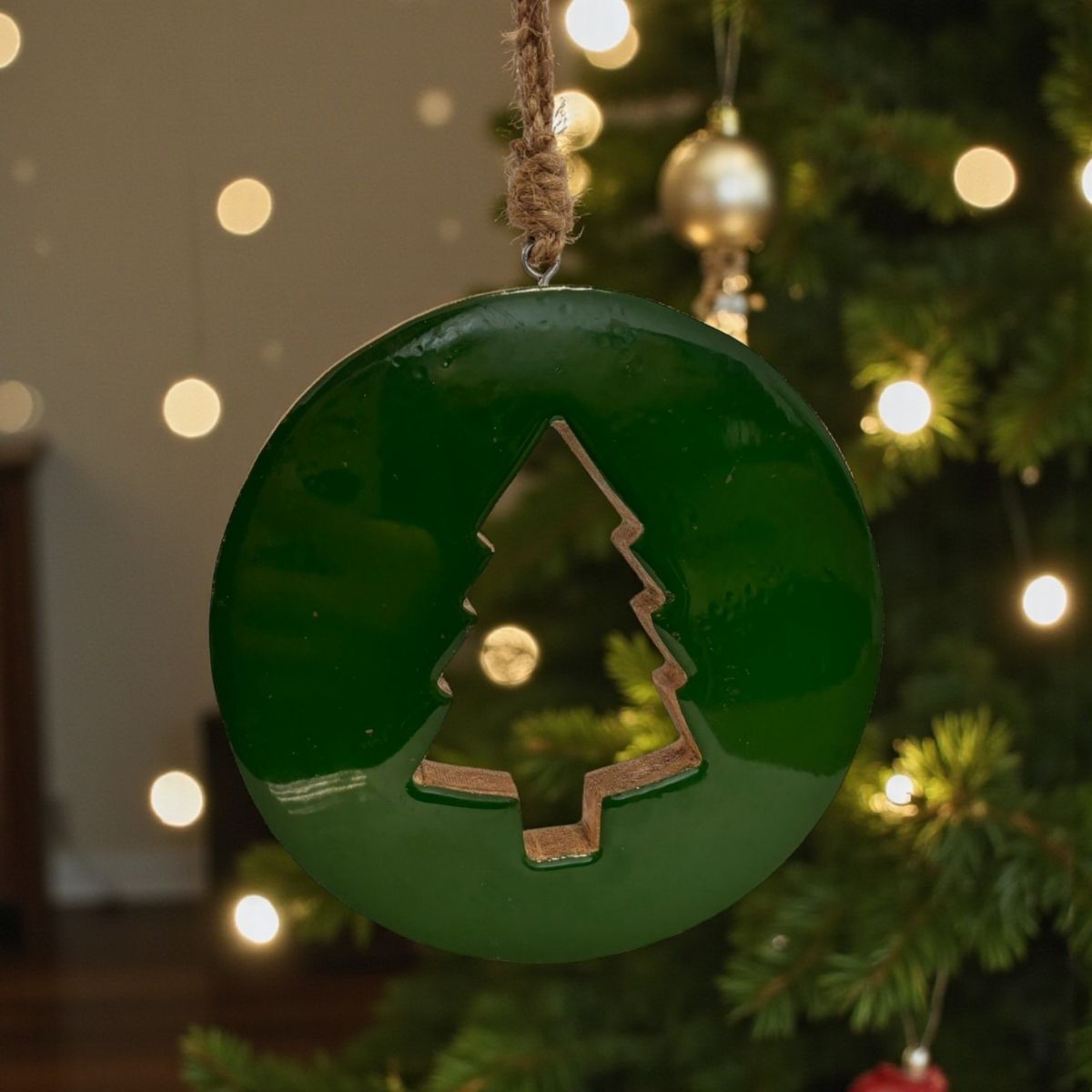 O Enfeite Para Pendurar de Natal - Bola com Árvore de Natal é uma peça moderna e encantadora, perfeita para quem deseja adicionar um toque sofisticado à decoração natalina. Com formato de bola plana verde, este enfeite se destaca pelo recorte central em formato de árvore de Natal, criando um visual elegante e contemporâneo que combina com diferentes estilos de decoração.
