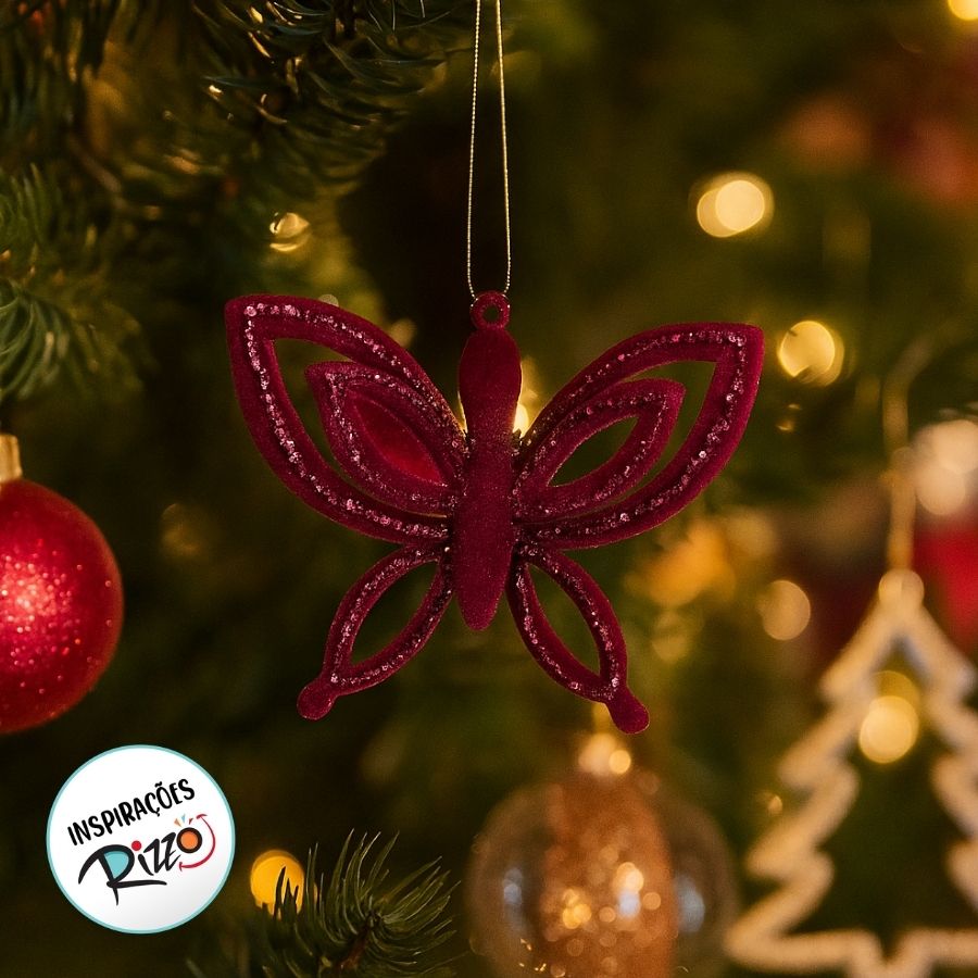 O Enfeite Para Pendurar de Natal Borboleta Glitter Vinho é resistente, elegante e perfeito para decorações natalinas sofisticadas, delicadas e brilhantes.
