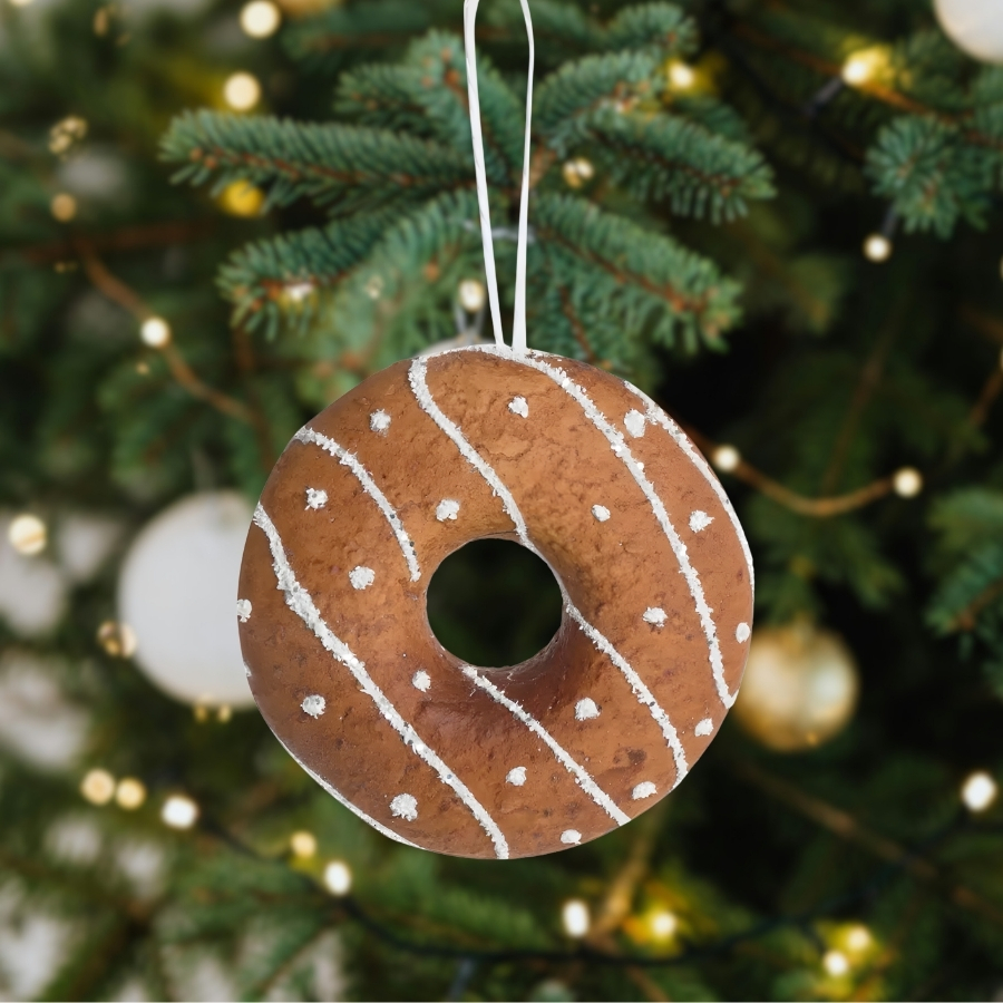 Enfeite natalino para pendurar em formato de donut, na cor marrom claro, medindo 7x7x2,5cm. Indicado para árvores, guirlandas e ambientes festivos, unindo diversão e praticidade.