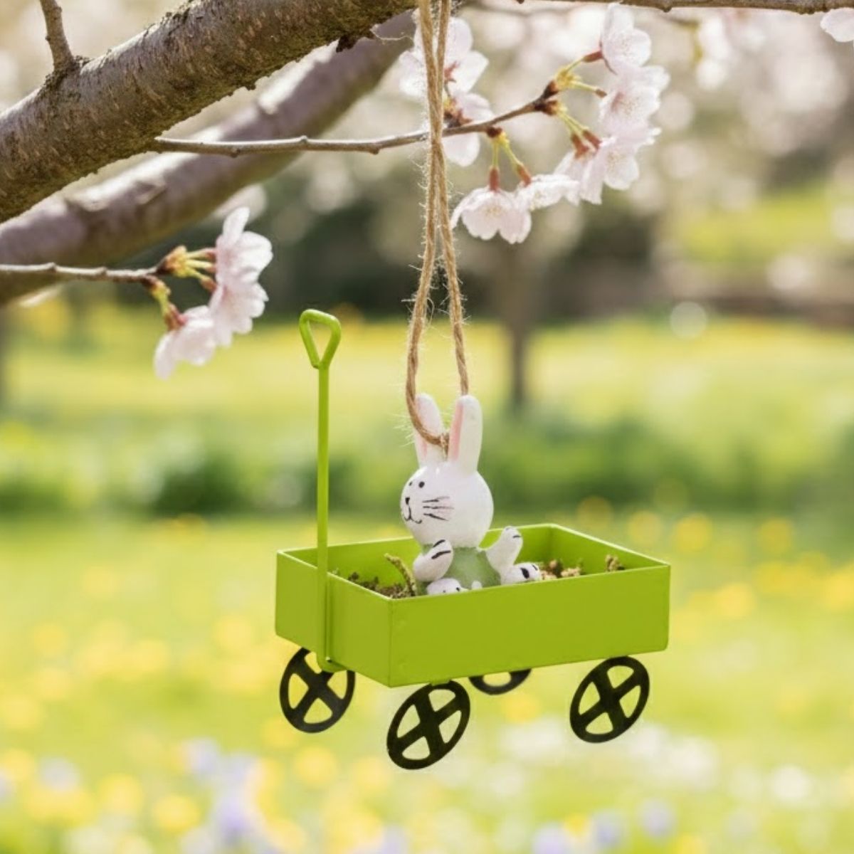 Use o enfeite de carrinho com coelho para pendurar em galhos secos, guirlandas ou arranjos decorativos. Combine com ovos de páscoa decorativos, flores, coelhos e outros elementos temáticos para uma decoração harmoniosa. Também pode ser usado como detalhe em lembrancinhas ou vitrines.