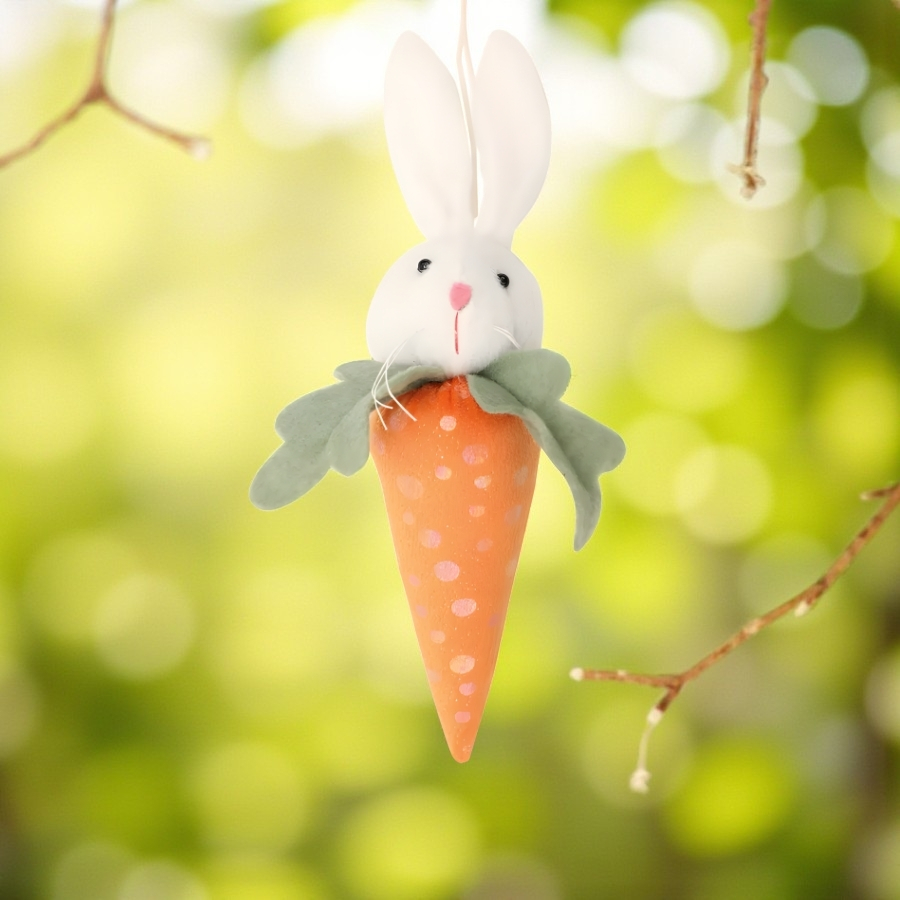 O Enfeite de Pendurar de Páscoa mede 23x6cm e é confeccionado em material leve e resistente. Possui uma cenoura decorativa com um coelho branco aplicado, além de um cordão para pendurar facilmente em diversos locais. Ideal para composições criativas e decorações sazonais.