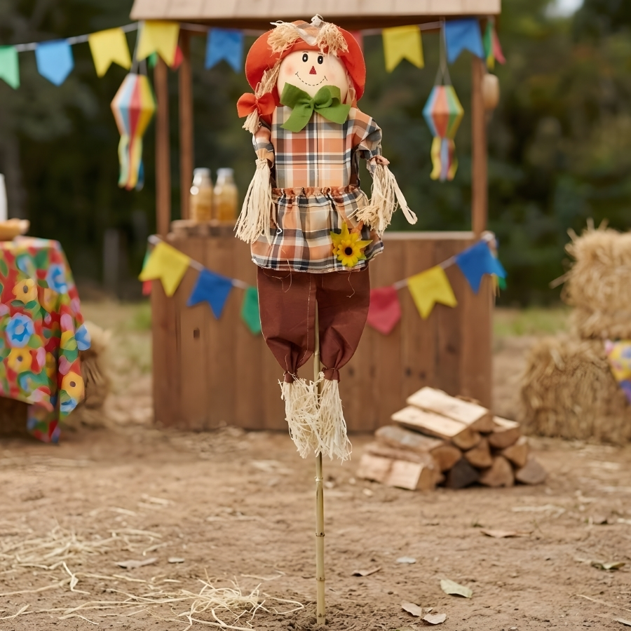 Trata-se de um espeto decorativo para jardim, confeccionado em bambu, com formato de espantalho grande, nas cores laranja e marrom, medindo 75x25cm. Indicado para uso decorativo, especialmente em áreas externas. Não há informações no título sobre tratamento do material ou resistência a intempéries. Recomenda-se evitar exposição prolongada a condições adversas e realizar o manuseio com cuidado para preservar suas características.