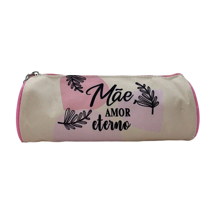 Estojo Redondo com fundo de cor bege, ziper rosa e a mensagem "Mãe Amor Eterno"
