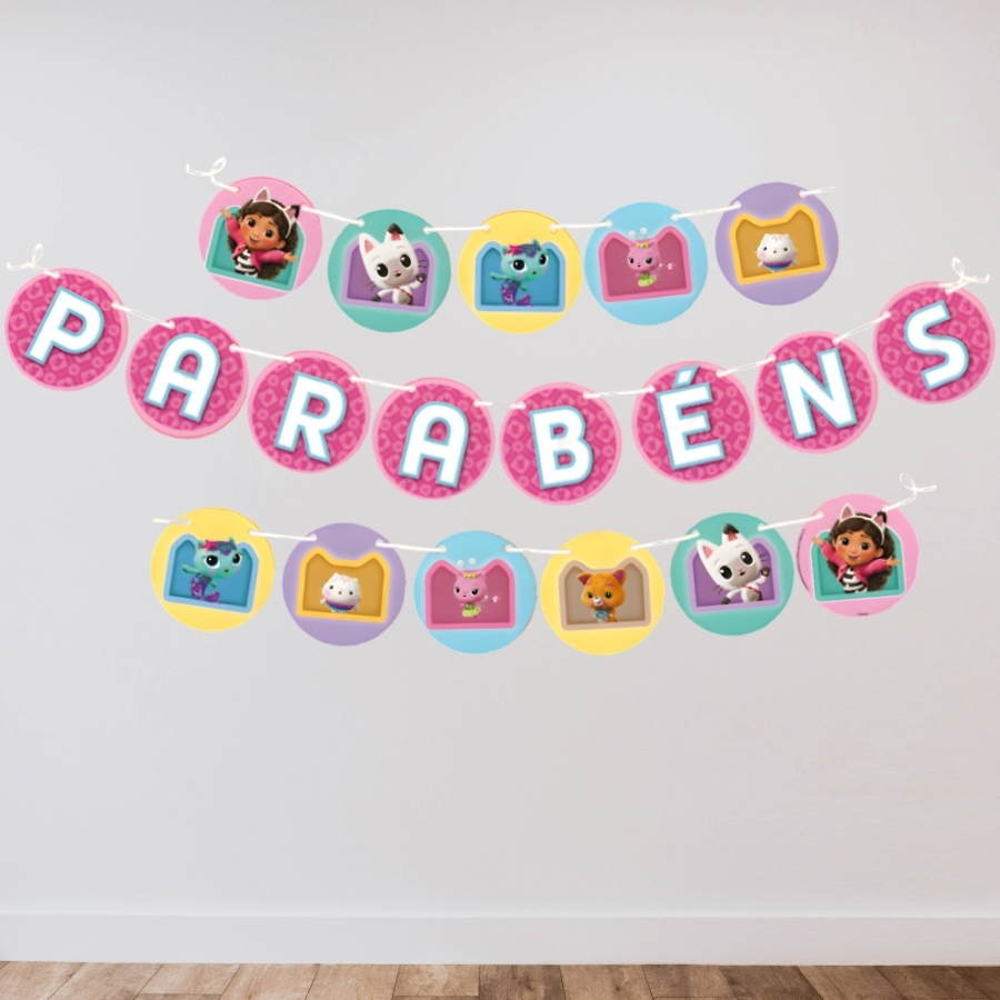 Ideal para festas infantis, a faixa Casa Mágica da Gabby pode ser combinada com outros itens da linha, como copos, pratos e adesivos, garantindo uma decoração harmoniosa e temática. Sua extensão de 2,8 metros permite decorar portas, paredes ou painéis, tornando a ambientação da festa completa e impactante.