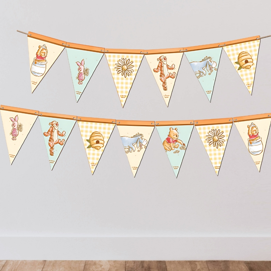 A Faixa Decorativa Ursinho Pooh mede 2,7m, é confeccionada em material resistente e colorido, pronta para uso em festas infantis, eventos temáticos ou comemorações especiais, garantindo praticidade e charme na decoração.