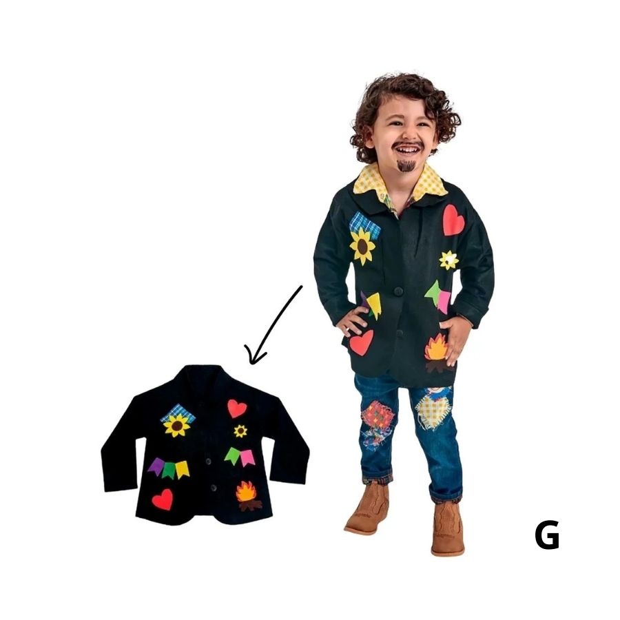 Fantasia infantil junina em paletó com figuras temáticas, tamanho G, ideal para festas, quadrilhas e apresentações com conforto e estilo.