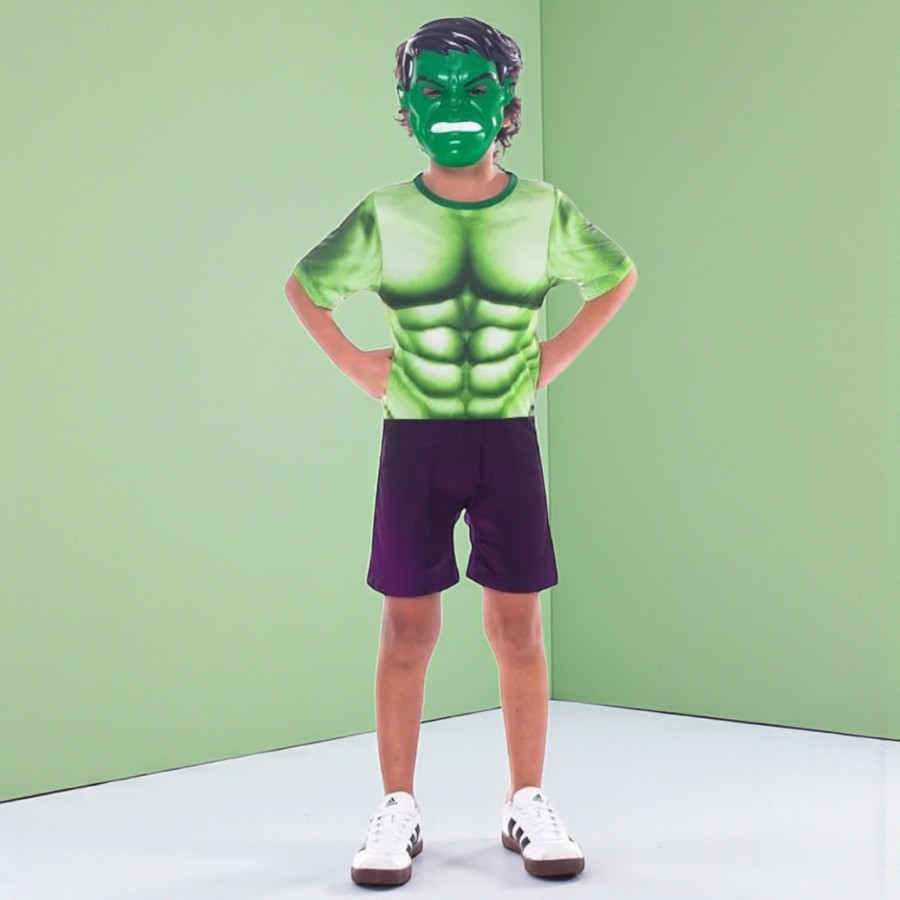 Fantasia infantil inspirada em Hulk Marvel, Composta por uma máscara e um macacão modelo curto.