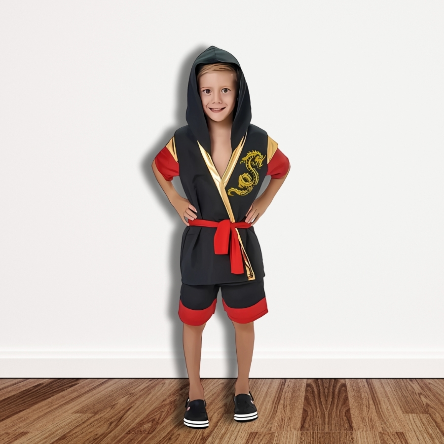 A Fantasia Infantil Super Ninja GG é perfeita para crianças que adoram aventuras e artes marciais! O conjunto inclui um roupão curto com capuz, shorts confortáveis e um cinto ajustável, formando um visual completo e estiloso de ninja. Feita com tecido leve e de boa qualidade, proporciona conforto e liberdade de movimentos durante as brincadeiras.