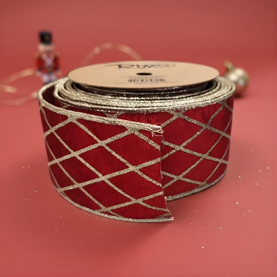 Fita aramada decorativa nas cores vermelho com aplicação de glitter dourado, medindo aproximadamente 6,3cm de largura por 9,14 metros de comprimento. Possui arame nas bordas, permitindo modelagem e fixação de formas. Indicada para uso decorativo em laços, embalagens e composições temáticas. Pode ocorrer desprendimento de partículas de glitter durante o manuseio. Recomenda-se evitar contato com umidade para preservar as características do produto.