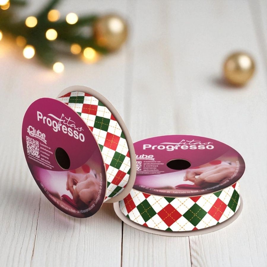 A Fita de Cetim 10m x 15mm - Cor 099 Xadrez Natalino Argyle Branco é ideal para trazer sofisticação e charme às decorações de fim de ano. Com um elegante padrão xadrez natalino argyle, ela combina o brilho suave do cetim com o estilo clássico das estampas festivas, sendo perfeita para criar laços, decorar presentes e compor arranjos natalinos.