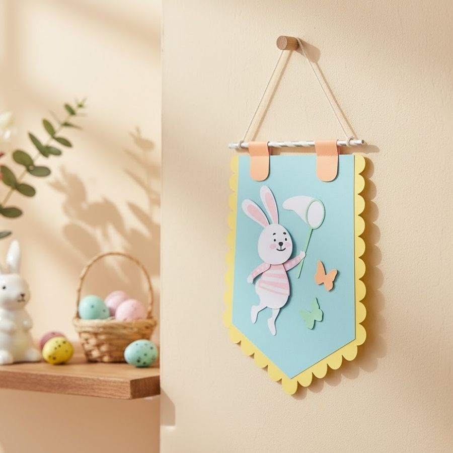 Flâmula de papel com estampa de coelho capturando borboletas, ideal para decorar ambientes de Páscoa. Leve, colorida e com acabamento de qualidade, perfeita para paredes e composições temáticas.