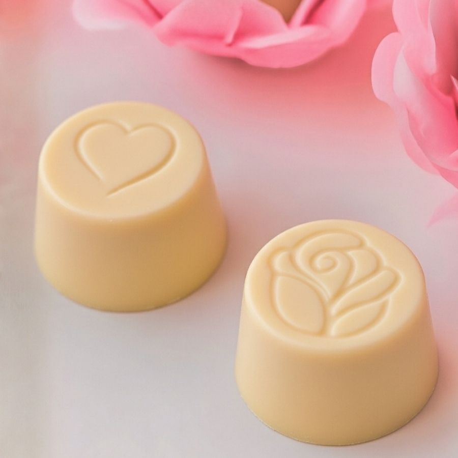 Forma especial de acetato com 3 partes sendo uma delas flexível, com o formato de bombom redondo com desenhos de flores e corações