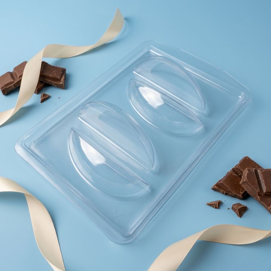 Forma prática de acetato para produzir fatias de ovo de chocolate de aproximadamente 24g, composta por kit com 3 partes sendo 2 formas rígidas em PET e 1 forma flexível em PEBD, ideal para confeitaria e produção de chocolates artesanais.