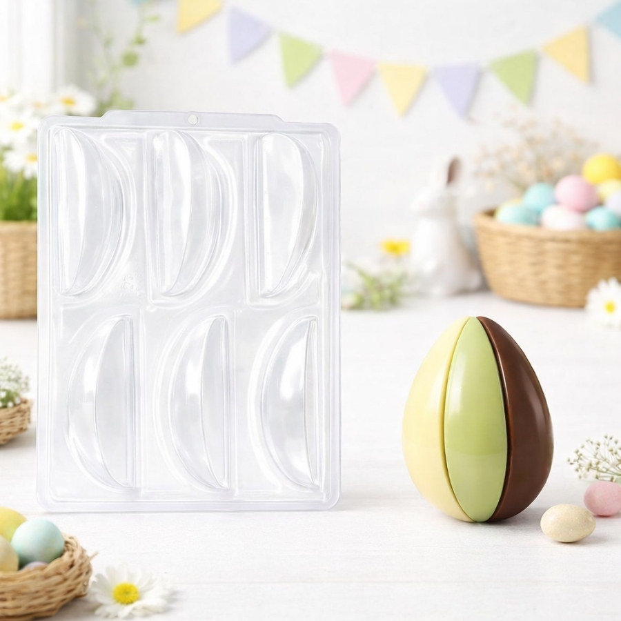 Prática e fácil de usar, essa forma de acetato para ovo de Páscoa possibilita desenformar o chocolate com facilidade, mantendo os detalhes do molde bem definidos. Seu formato em fatias é ideal para montar ovos recheados, sobremesas criativas ou kits especiais de Páscoa. É uma ótima opção para quem busca praticidade na produção e um resultado bonito e profissional.