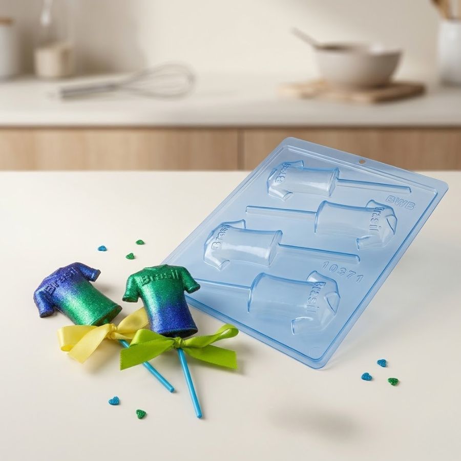 A forma simples para pirulito de chocolate formato camisa do Brasil é perfeita para quem deseja criar doces temáticos, criativos e com excelente acabamento. Produzida em acetato resistente e flexível, essa forma para chocolate permite desenformar com facilidade, garantindo brilho, definição de detalhes e praticidade no preparo. Ideal para quem busca agilidade na confeitaria artesanal, ela é uma ótima opção para produções rápidas com resultado profissional.