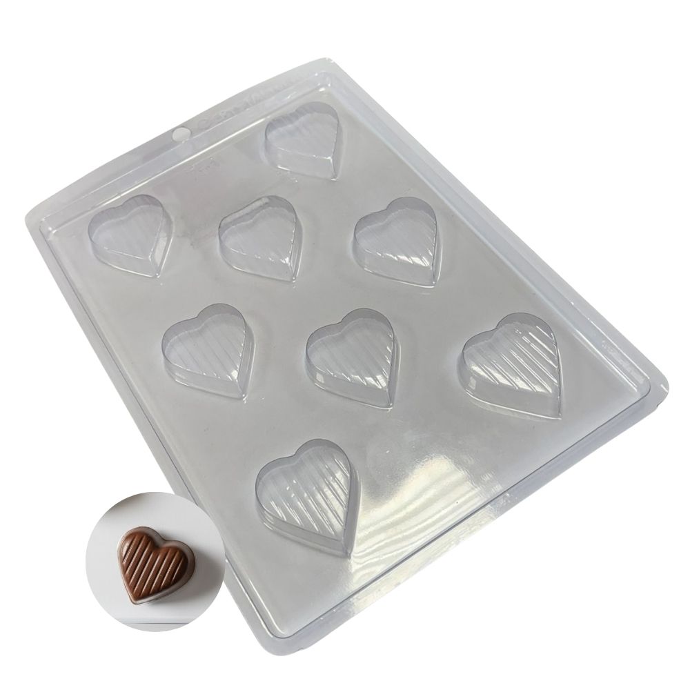 Produzida em acetato, a forma oferece fácil desenforme e ótima definição dos detalhes listrados, valorizando o visual do coração. Perfeita para chocolates artesanais, lembrancinhas e produções temáticas, é uma excelente escolha para quem busca eficiência e acabamento profissional.