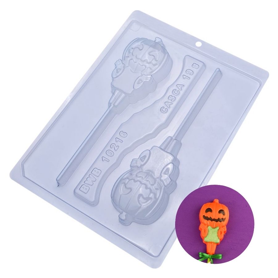 A Forma Especial de Acetato Pirulito Abóbora Halloween 3 Partes, que são duas rígidas e uma flexível, é ideal para confeiteiros que desejam criar pirulitos de chocolate ocos grandes e temáticos. Produzida em acetato resistente com encaixe de silicone, possui 2 cavidades de aproximadamente 19cm cada, moldando pirulitos no formato de abóboras com mãozinhas, perfeitos para festas de Halloween, lembrancinhas e decorações criativas.