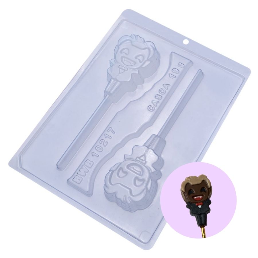 A Forma Especial de Acetato Pirulito Drácula 3 Partes, que são duas rígidas e uma flexível, é perfeita para confeiteiros que desejam criar pirulitos de chocolate ocos com praticidade e acabamento profissional. Produzida em acetato resistente com encaixe de silicone, possui 2 cavidades de aproximadamente 17cm cada, moldando pirulitos temáticos no formato do Drácula, ideais para festas de Halloween e lembrancinhas criativas.